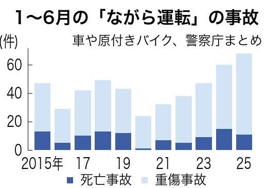 車や原付きバイクを運転中にスマートフォンなどを使う「ながら運転」による死亡・重傷事故が今年1~6月(上半期)に全国で68件あり、統計を取り始めた2007年以降で最多だった。警察庁が発表した。