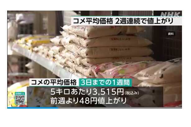 それによりますと、今月3日までの1週間に販売されたコメの平均価格は5キロあたり税込みで3515円と、前の週より48円値上がりしました。