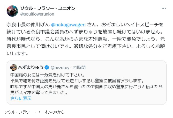 ロックバンド「ソウル・フラワー・ユニオン」の中川敬氏が、自身のX(旧ツイッター)アカウントで奈良市議会議員のへずまりゅう氏の投稿を取り上げ、奈良市長に対し「適切な処分をご考慮下さい」と呼びかけました。中川氏は、へずま氏が行った一連の発言を「あからさまな差別煽動」と批判しています。