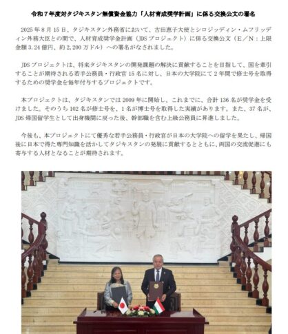 8月15日(現地時間同日)、タジキスタン共和国の首都ドゥシャンベにおいて、古田恵子駐タジキスタン共和国日本国特命全権大使と、シロジッディン・ムフリッディン・タジキスタン共和国外務大臣(His Excellency Mr. Sirojiddin MUHRIDDIN, Minister of Foreign Affairs of the Republic of Tajikistan)との間で、総額3.24億円を限度とする無償資金協力「人材育成奨学計画」(若手行政官等の留学プログラム)に関する書簡の署名・交換が行われました。