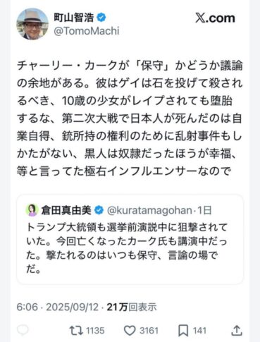 町山智浩さん「チャーリー・カークざまぁ」しまくるも米ビザ取り消しにビビりポスト全消し