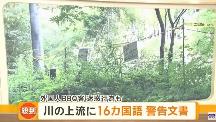 群馬県にある川の上流で、16カ国の言語でごみの放置を警告する文書を掲げている場所があります。下流でバーベキューが禁止になったことで、今度は上流で迷惑行為が深刻になっています。