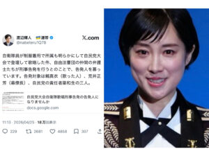 - 自民党大会での自衛官歌唱めぐり、弁護士らが刑事告発人を募集していると話題に[26/04]