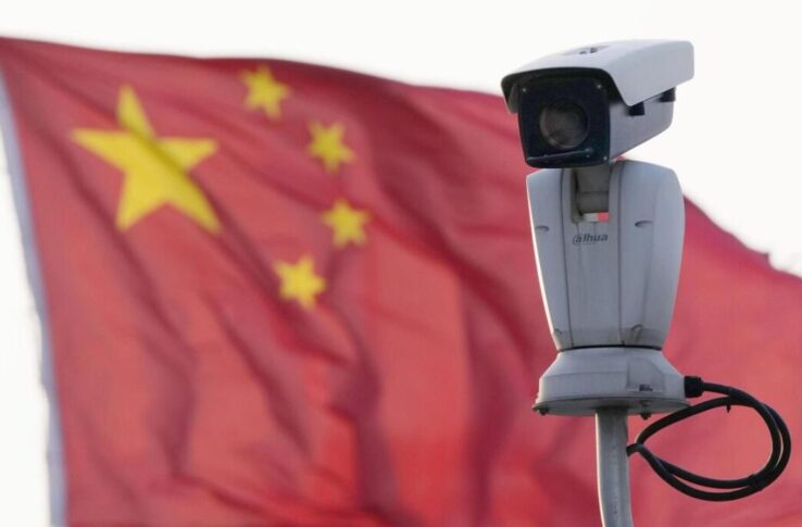 掲げられた中国国旗と監視カメラ=4月、中国上海市(共同)(KYODONEWS)