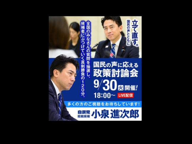 小泉進次郎氏「9/30(火)18時より「国民の声に応える政策討論会」に参加します。 どうぞご覧ください。」→コメント欄は閉鎖のままXで告知