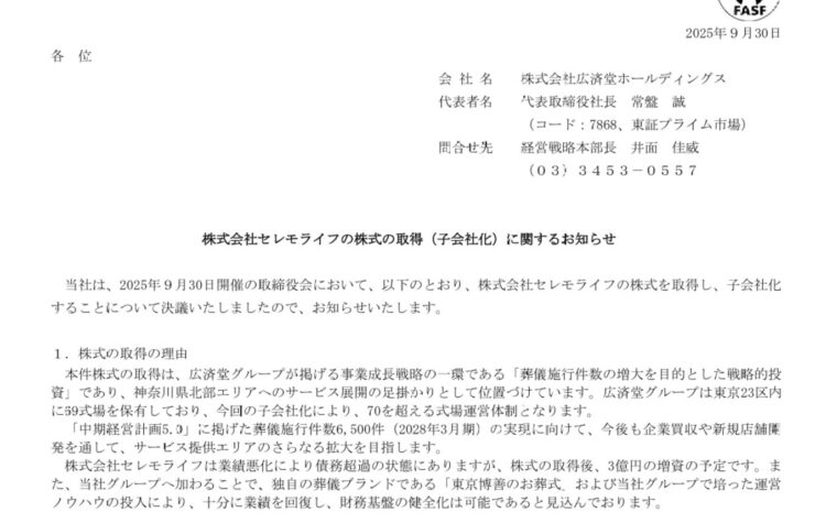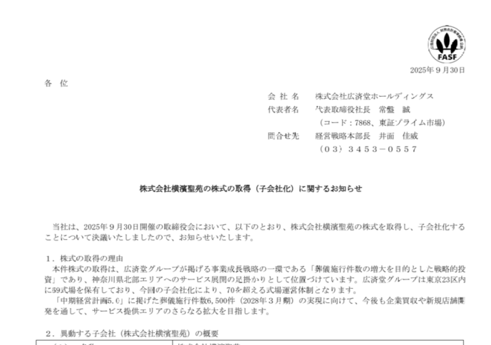 株式会社広済堂ホールディングス(東京都港区、代表取締役 常盤誠、以下「広済堂HD」)は、葬儀式場運営及び神奈川県ランキング1位の納骨堂*における管理・販売を受託する株式会社横濱聖苑(神奈川県横浜市)、創業30年の地域密着型葬儀式場を運営する株式会社セレモライフ(神奈川県横浜市)の株式譲渡契約を締結し、2025年11月1日より子会社化することを、9月30日の取締役会において決定いたしました。