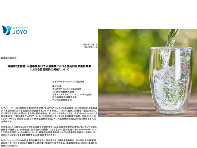 [プレスリリース:城陽市ウォーターPPP資料]https://www.veolia.jp/sites/g/files/dvc2651/files/document/2025/10/%E3%83%97%E3%83%AC%E3%82%B9%E3%83%AA%E3%83%AA%E3%83%BC%E3%82%B9%EF%BC%9A%E5%9F%8E%E9%99%BD%E5%B8%82%E3%82%A6%E3%82%A9%E3%83%BC%E3%82%BF%E3%83%BCPPP_0.pdf