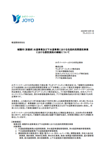 みずパートナーJOYO共同企業体(代表企業:ヴェオリア・ジェネッツ株式会社)は、「城陽市水道事業及び下水道事業における包括的民間委託事業(以下「本事業」)」において優先交渉権者に選定され※1、2025年9月30日に城陽市公営企業と契約を締結しましたのでお知らせします。みずパートナーJOYO共同企業体は、代表企業をヴェオリア・ジェネッツ株式会社とし、フジ地中情報株式会社(ヴェオリアグループ)、日本メンテナスエンジニヤリング株式会社、西日本旅客鉄道株式会社、アジア航測株式会社の計5社で構成する共同企業体です。