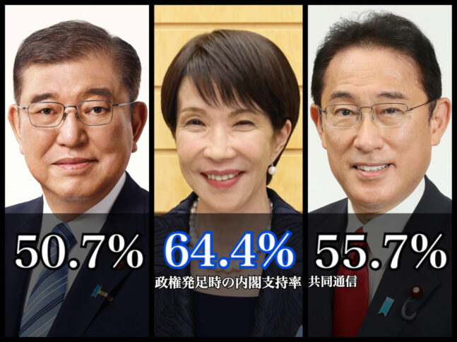 内閣支持率は64.4%で、発足時では石破内閣の50.7%、岸田内閣の55.7%を上回った。