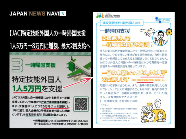 【JAC】特定技能外国人の一時帰国支援を拡充 実質的に税金が関与?公的資金で1人5万円→8万円に増額・支給も1回→2回へ[2025年度]