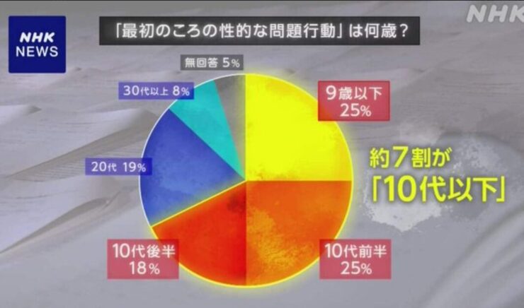 - 「刑務所やクリニック等で全国アンケートの結果、スカートめくり等を含む、性加害者の7割が10代以下で最初の性的問題行動を起こしている。」とのことでした