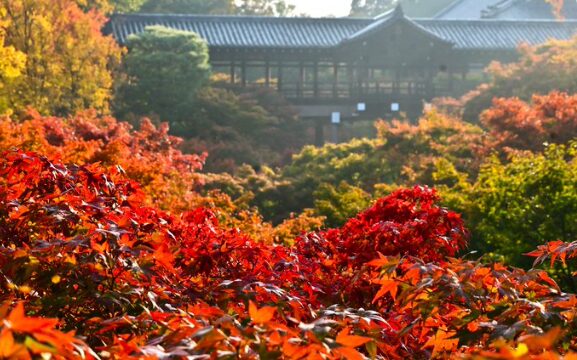 「東福寺」の臥雲橋から撮影する紅葉越しの通天橋。