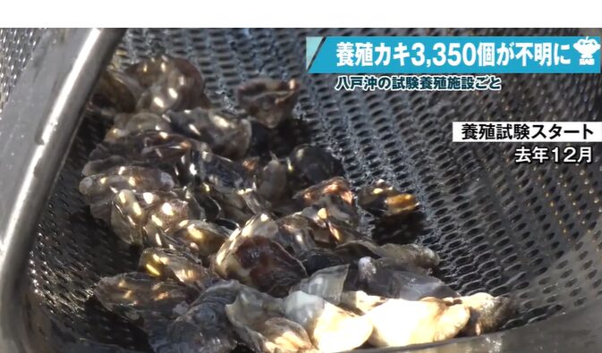 青森県八戸市の前沖で養殖試験が行われていたカキ3,350個の行方が分からなくなっている。市によると、昨年末から試験的に設置していた沖合の養殖設備が、先月21日以降、海上から確認できなくなり、カキが入った養殖カゴも見つかっていないという。10月時点では異常は確認されておらず、比較的短期間のうちに状況が一変した可能性がある。