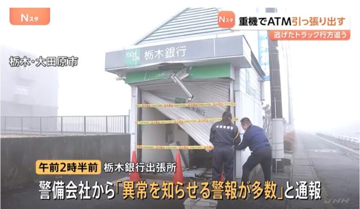 きょう未明、栃木県大田原市下石上にある栃木銀行のATM出張所で、重機を使ってATMが破壊される事件が発生しました。警察の発表によりますと、午前2時半前、出張所の出入り口が重機によって壊され、設置されていたATMが外に引きずり出されたということです。現場では警報が作動し、駆け付けた警備員が、近くにいた人物がトラックの助手席に乗り込み、そのまま走り去る様子を目撃しています。警察は窃盗事件として捜査を進めており、逃走したトラックの行方を追うとともに、犯行に使われた重機の入手経路など、当時の詳しい状況を調べています。深夜の住宅地近くで起きた大胆な手口に、地域では驚きの声が上がっています。