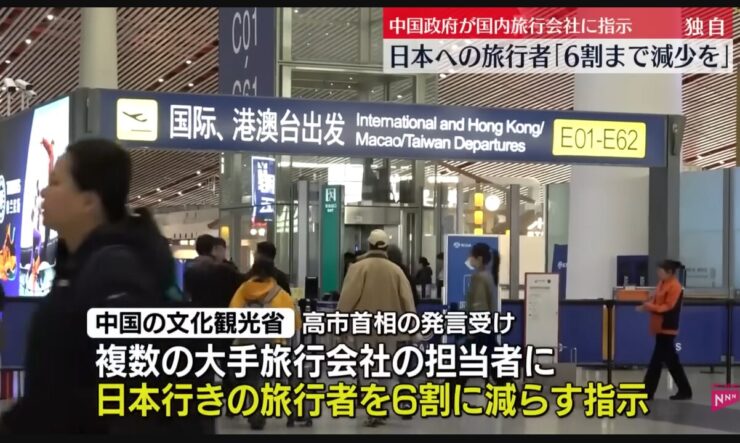 複数の関係者によりますと、中国の文化観光省は、高市首相の台湾有事をめぐる発言を受けて、複数の大手旅行会社の担当者を集め、日本行きの旅行者をこれまでの6割にまで減らすように指示したということです。 政府から指示が出されたことについては、口外しないように注意があったということです。