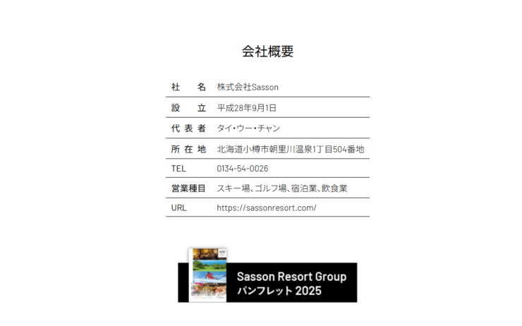 また、運営会社の公式ホームページに掲載されている会社概要によると、朝里川温泉スキー場を運営しているのは「株式会社Sasson」で、2016年9月設立の企業とされている。代表者としてタイ・ウー・チャンの氏名が記載されており、所在地は北海道小樽市朝里川温泉1丁目504番地となっている。営業内容としては、スキー場やゴルフ場の運営のほか、宿泊業や飲食業などを手がけていることが明記されており、電話番号や公式ウェブサイトのURLも公開されている。