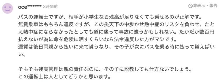 【記事に対するヤフコメのバス運転手がカッコイイと話題】小学校低学年の男子児童ICカード残高不足でバス運転手が威圧的態度!猛暑の中、児童は2時間ほどかけ徒歩で帰宅