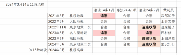同種訴訟は2019年2月以降、札幌、東京、名古屋、大阪、福岡の5地裁に6件起こされており、今回が最後の1審判決だった。 これまでの5件はいずれも賠償請求は棄却されているが、札幌、名古屋の両地裁が「違憲」、東京(1次)、福岡の両地裁が「違憲状態」、大阪地裁が「合憲」とそれぞれ指摘し、判断が分かれていた。 訴訟では現行制度が、婚姻の自由を定めた憲法24条1項▽個人の尊厳と両性の平等に基づいた家族法の制定を求める24条2項▽法の下の平等を定めた14条――に違反しているかどうかが争点となった。 同性カップル側は、婚姻の自由の保障は同性カップルにも及ぶ上、憲法24条2項も同性カップルが法的に家族となる利益を保障するために必要な法整備を国会に要請していると主張した。異性カップルが婚姻により得られる税制や社会保障の優遇を同性カップルが得ることができていないのは不合理な差別に当たるとし、国会は同性婚を認める法整備を怠ったと訴えた。 これに対し国側は、「両性」や「夫婦」という文言を用いた憲法24条1項は、同性同士の婚姻を想定していないと反論した。24条2項が国会に要請している法整備についても、異性カップルの婚姻を前提としていると指摘。現行制度は同性カップルを差別するものではなく、憲法14条にも違反しないとしていた。 今回の判決の対象となった同性カップル側は21年3月に東京地裁では2次となる追加の訴訟を起こしていた。14日午後には札幌高裁で控訴審としては初めてとなる判決が言い渡される予定。