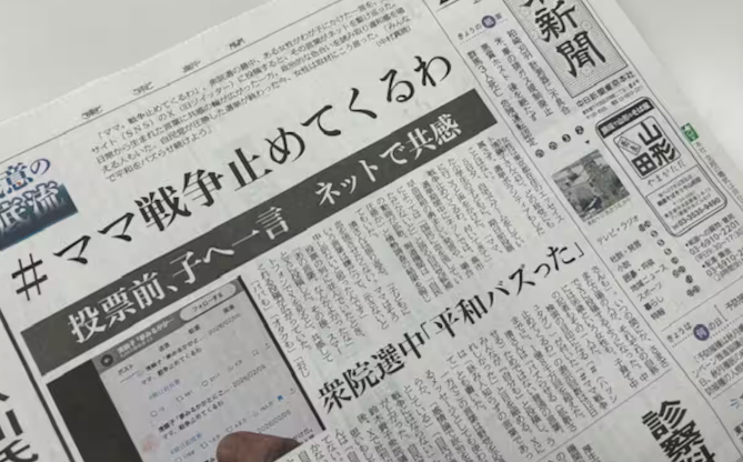 衆院選終盤、SNSを通じて話題になった政治的なハッシュタグ「#ママ戦争止めてくるわ」。東京新聞は投開票後の2月14日付け1面トップで大きく取り上げ、「平和バズった」「ネットで共感」などの見出しを付けてうれしそうだった。