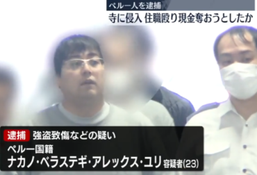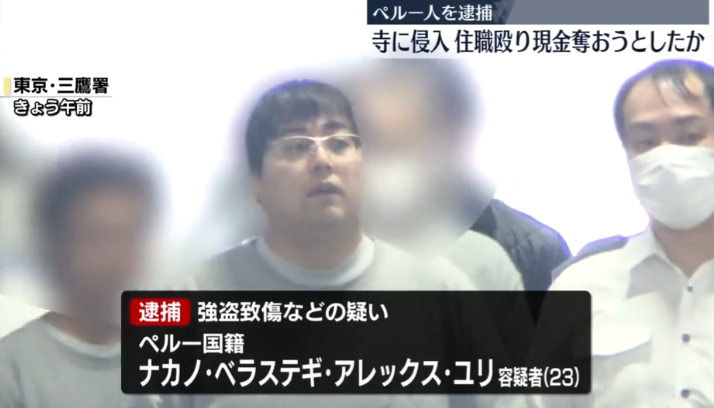 - 寺に強盗? 住職のお婆さんを殴ったペルー国籍のナカノ・ベラステギ・アレックス・ユリ容疑者 深夜に東京 小金井市の寺に侵入し、寝ていた80代の女性住職の顔や腹を殴り、ろっ骨を折るなど全治4週間のケガをさせて逃走 許せない。