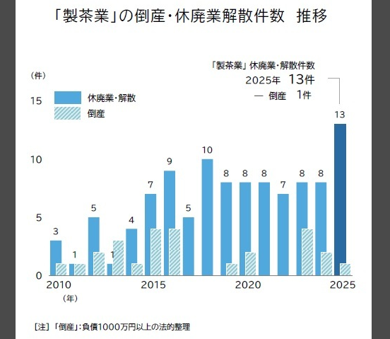 「抹茶スイーツ」や「抹茶ラテ」など、空前の「抹茶ブーム」が中小製茶業者の経営を揺さぶっている。2025年に発生した「製茶業」の休廃業・解散(以下「廃業」)は累計13件判明し、前年(8件)を大きく上回り過去最多を更新した。倒産(1件)を含めると、年間で14の製茶業者が市場から退場した。抹茶ブームで日本茶に注目が集まる一方、煎茶原料の「価格高騰」と抹茶以外の「需要低迷」から経営が不安定化し、事業継続を諦める製茶現場が増えつつある。