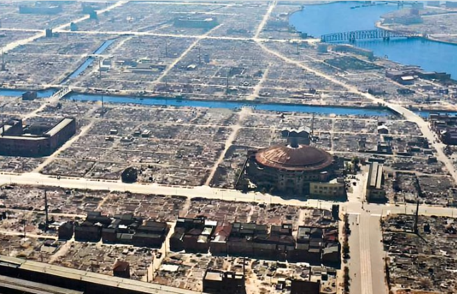 米軍はこうした都市構造を事前に研究していたとされています。江戸時代の大火や関東大震災の記録を分析し、日本家屋を模した実験施設を作って延焼の広がり方を検証したという記録も残っています。さらに当日は強い北西風が吹いており、火災は瞬く間に拡大しました。炎は火災旋風と呼ばれる巨大な渦を作り、風速25メートル近い暴風が街を襲ったと伝えられています。その結果、一夜で27万戸が焼失し、100万人以上の生活圏が破壊されました。人類の歴史の中でも極めて大きな都市破壊の一つとして語り継がれています。