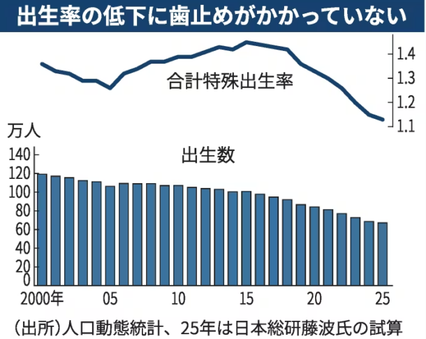 【出生数は初の68万人割れ】25年出生率1.13前後 民間試算[日経]26/02