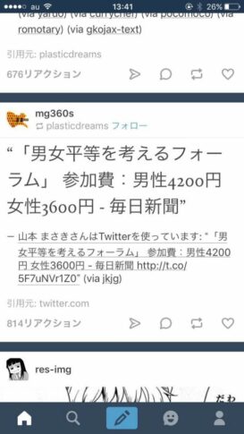 - 別に『男女平等を考えるフォーラム』なんだから、男女の参加費に格差あってもいいだろ。 参加費だって現在の日本内で雇用機会格差や賃金格差が男女で存在するんだから。