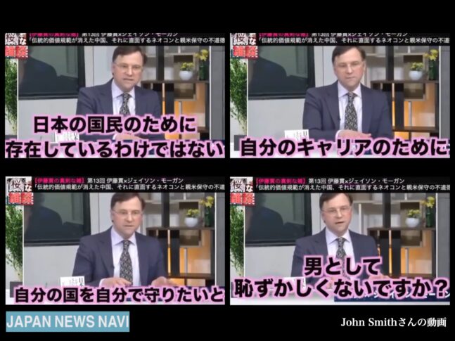 また、モーガン氏の「自分の国を守りたいと思わないんですか?」という問いかけには、まさにその通りだと感じました。自民党の議員たちは本当に国を守るために政治をしているのでしょうか?今の日本の政治家の多くは、他国の圧力や利益に屈し、国民を守るための強い意志を感じることができません。特に、中国や韓国、さらにはアメリカからの影響を受け、独立した国としての立場を貫けない政治家が多いように見えます。これは、日本の主権が侵されている証拠であり、非常に危険な状態だと思います。