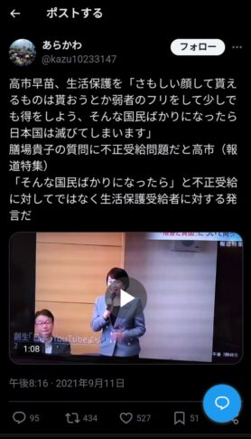 【ツイッター速報さんの投稿】【正論】高市早苗「がめつい生活保護受給者ばかりになればこの国は滅びます」