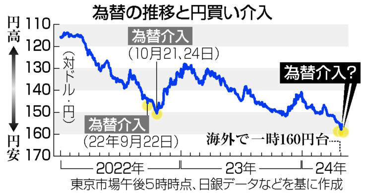 【シンガポール共同】3日の外国為替市場の円相場は円が対ドルで上昇し、一時1ドル=152円台後半を付けた。4月中旬以来、約3週間ぶりの円高ドル安水準。日本政府・日銀による為替介入への警戒感から、円買いドル売りが進んだ。 【グラフ】円相場の推移(対ドル)
