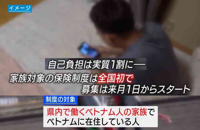 県は県内で働くベトナム人の家族に適用する医療保険制度を6月から導入すると発表しました。 医療保険制度は県内で働くベトナム人の家族でベトナムに在住している人を対象としています。 県によりますと、ベトナムでは健康保険が使える医療機関が限られているということですが、現地の保険会社と連携することでベトナム国内すべての病院で保険が適用されるということです。 また、自己負担も実質1割となるとしています。 ベトナム人は県内の外国人労働者のうち3割近くを占めていて、長崎知事は「安心して働いて暮らしていけるように活用してほしい」などとコメントしています。 家族を対象とした保険制度は全国で初めてです。