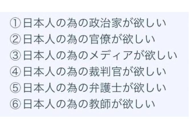 日本人として生まれ、日本で生活する以上、日本人のための政治や教育、司法が当然あるべきだと考えます。それが「当たり前」だと思っていました。しかし、現実を見ると、その「当たり前」が失われつつあるのではないかと感じることが増えています。だからこそ、今の時代において、日本人のための政治家、日本人のための官僚、日本人のためのメディアが必要だという意見には強く共感します。
