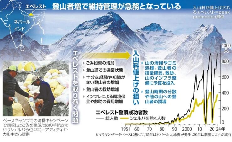 ネパール政府が今回の値上げに踏み切った背景には、登山者の急増、環境汚染、そして安全確保のコスト上昇といった複合的な問題があるとのことでした。登山者の排せつ物が雪解け水を汚染し、使用済みの酸素ボンベや生活ごみが山に放置され、登山道の整備や救助活動も追いつかない──そんな状況で、値上げは避けられない判断だったのでしょう。