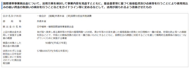 • 中国に血税90億円を出す。その結果でどれだけの木が植えられたか結果を国民は知る由もない。90億円の大半はキックバックされ、日中の関係者の外国口座に振り込まれるのではと疑念を抱く