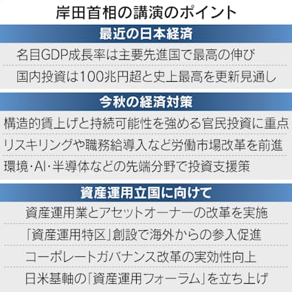 首相は政府が掲げる「資産運用立国」の実現に向けた策を語った。2000兆円を超える日本の個人金融資産を生かした資産運用ビジネスの発展をめざす姿勢を訴えた。