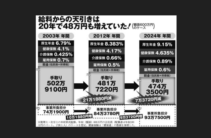近年、私たちが働いて得る給料からの天引き額が増え続けているという現実は、多くの国民にとって深刻な問題です。そして、その増加額が20年で合計48万円にもなるというデータが明らかになった今、この負担増加がどれほど大きな影響を及ぼしているのかを改めて考えさせられます。こうした状況が続けば、家計が圧迫され、日々の生活に支障をきたす人々が増えるのは避けられません。